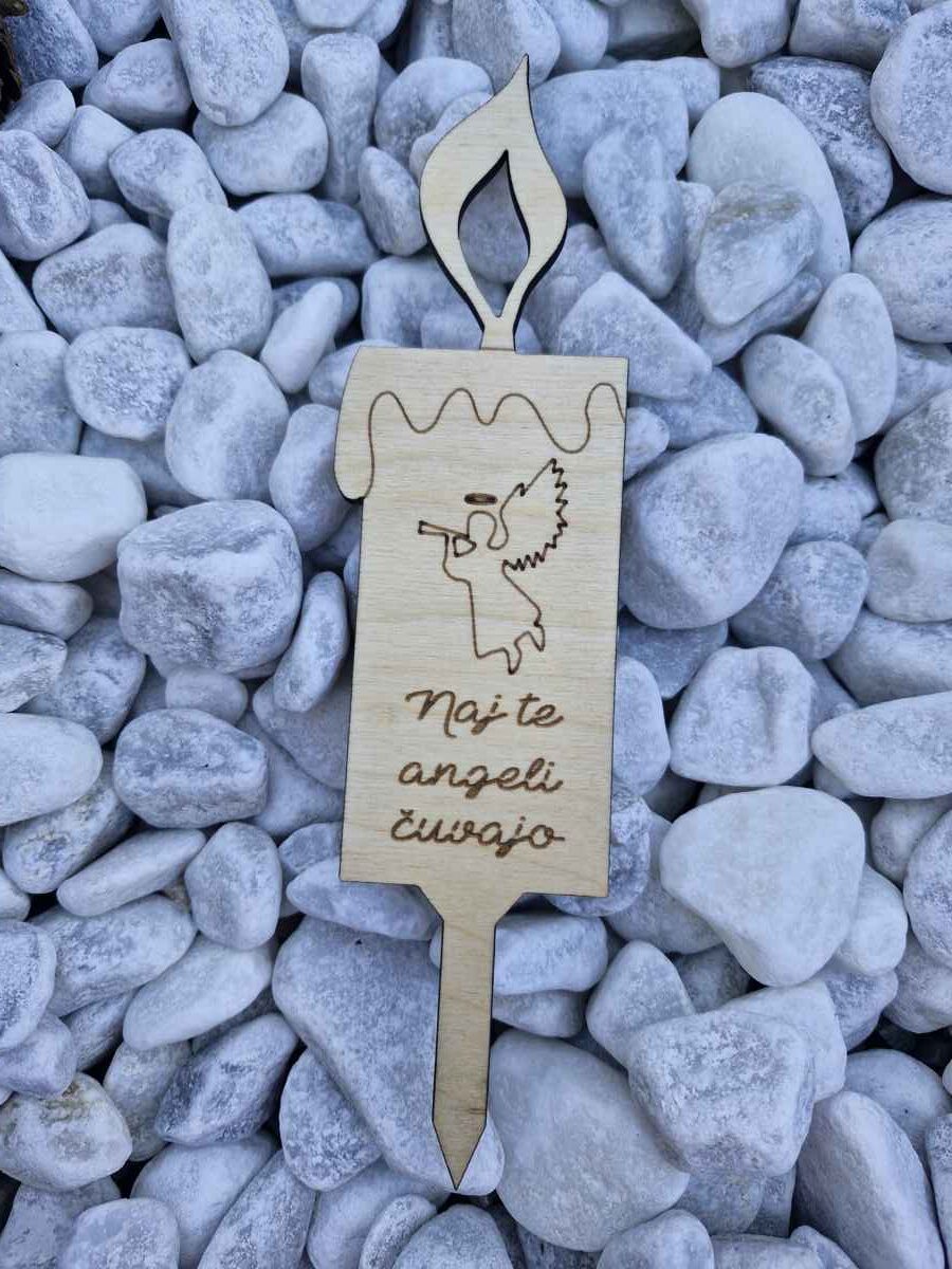 Lesena svečka za zapičit angelček s posvetilom. Namenjena za na grobove ali pa jo zapičimo v ikebano. Narejena iz vezane plošče topol 4mm, brez premaza čisto naravna in popolnoma razgradljiva.