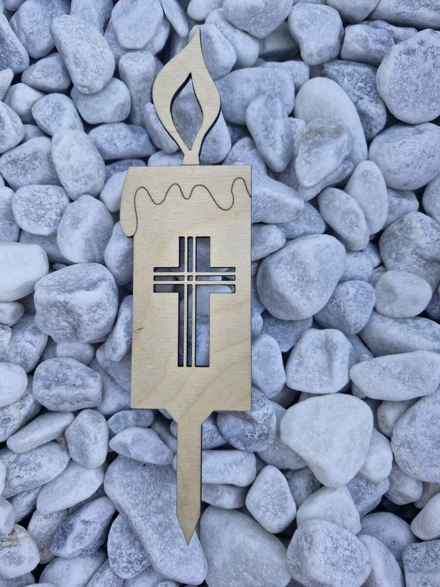 Lesena svečka za zapičit križ. Namenjena za na grobove ali pa jo zapičimo  v ikebano. Narejena iz vezane plošče topol 4mm, brez premaza čisto naravna in popolnoma razgradljiva.